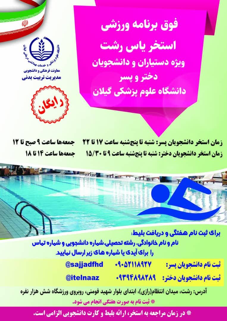 در این راستا، فوق‌برنامه ورزشی شنا به صورت رایگان در استخر یاس شهر رشت برگزار می‌شود. بر اساس برنامه زمان‌بندی، استفاده دانشجویان پسر از استخر از شنبه تا پنج‌شنبه ساعت ۱۷ تا ۲۲ و استفاده دانشجویان دختر از شنبه تا پنج‌شنبه ساعت ۹ تا ۱۵:۳۰ امکان‌پذیر است. همچنین در روزهای جمعه، ساعت ۹ تا ۱۲ برای پسران و ۱۴ تا ۱۸ برای دختران تعیین شده است.