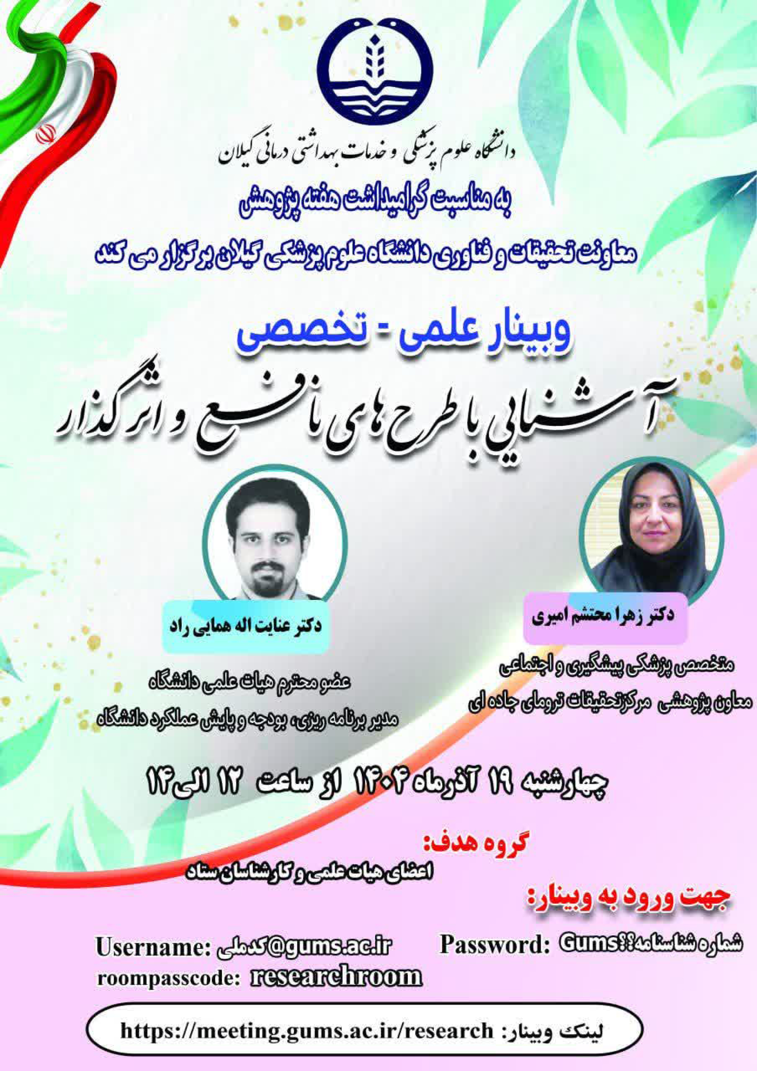 وبینار علمی تخصصی با عنوان آشنایی با طرحهای نافذ و اثرگذار، چهارشنبه ۱۹ آذرماه ۱۴۰۴ از ساعت ۱۲ الی ۱۴