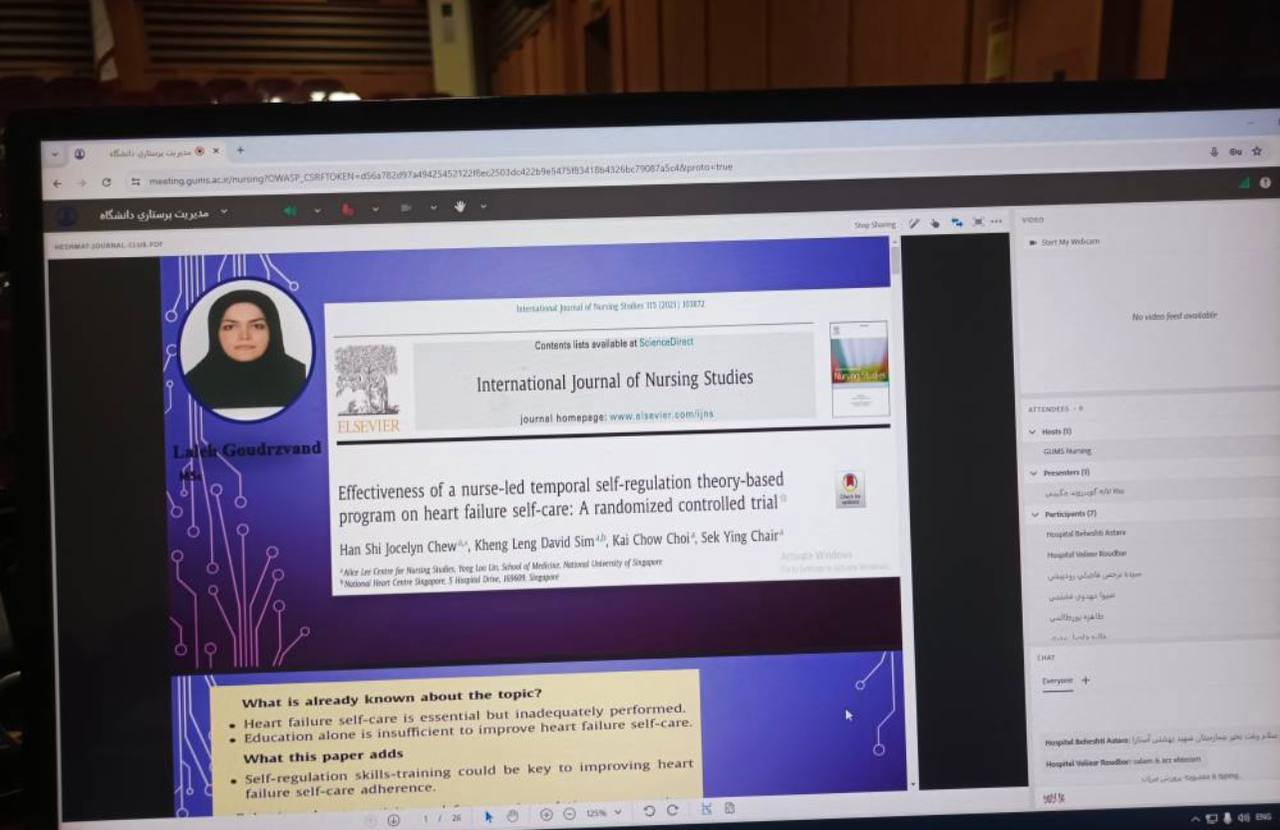 به گزارش پایگاه اطلاعرسانی دانشگاه علوم پزشکی گیلان (گیلوبدا)؛ ژورنال کلاب پژوهشی - آموزشی مدیریت امور پرستاری دانشگاه بهصورت مجازی با حضور کارشناسان ستادی و اعضای هستههای پژوهش مراکز درمانی تابعه با عنوان «Effectiveness of a nurse-led temporal self-regulationtheory-based program on heartfailure self-care:A randomized controlled trial» برگزار شد.