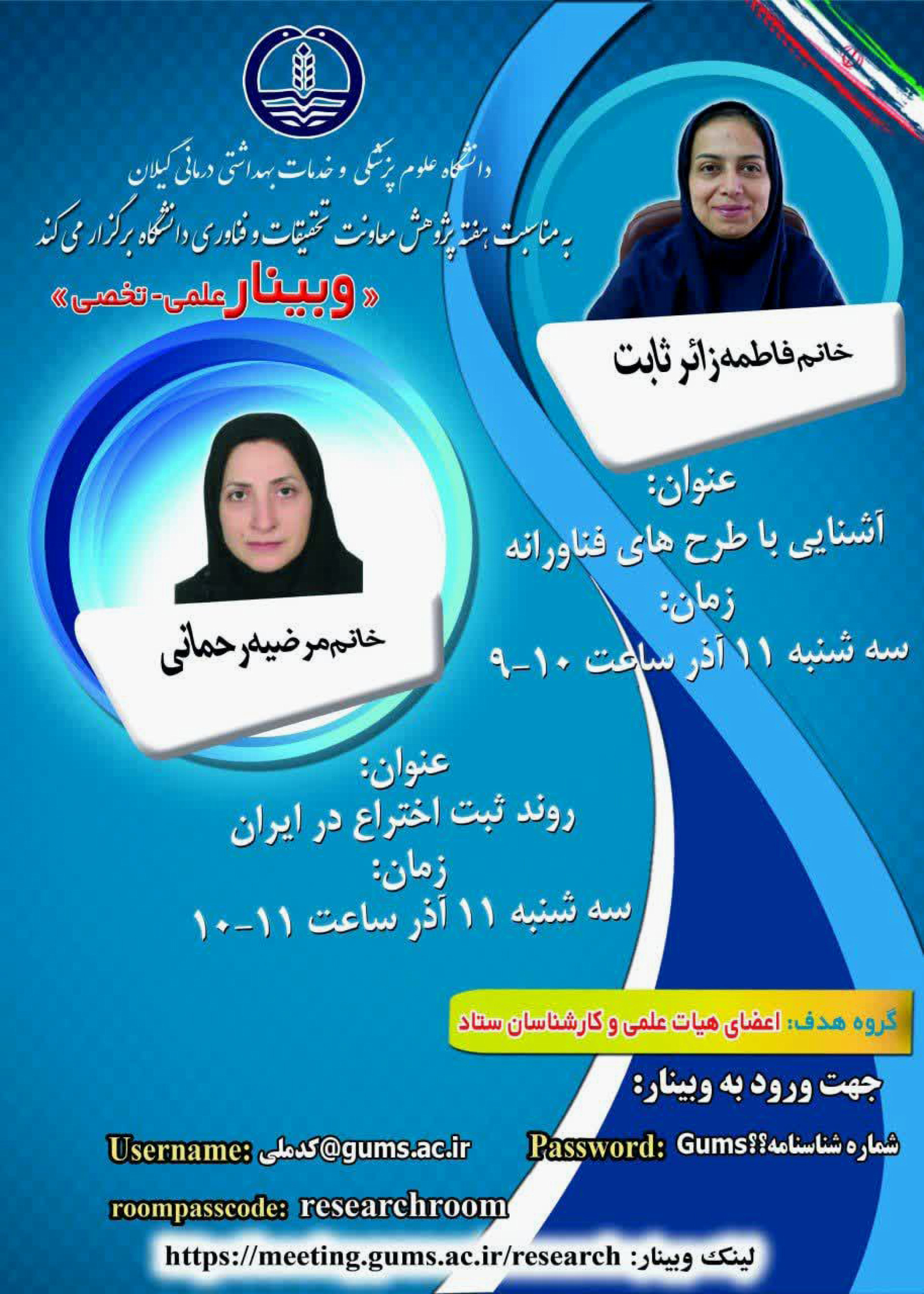به گزارش پایگاه اطلاع‌رسانی دانشگاه علوم پزشکی گیلان (گیل‌وب‌دا)؛ معاونت تحقیقات و فناوری این دانشگاه در چارچوب برنامه‌های هفته پژوهش، وبینار تخصصی با موضوع آشنایی با طرح‌های فناورانه و روند ثبت اختراع در ایران را سازماندهی کرده است.