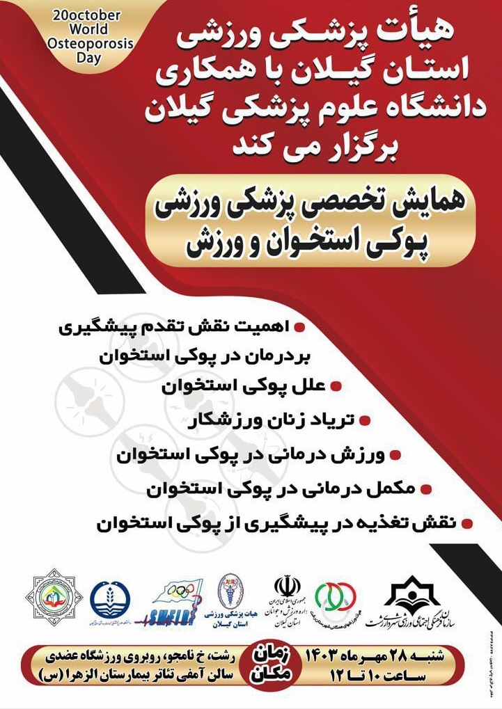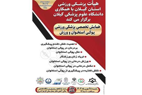 همایش تخصصی پزشکی ورزشی پوکیاستخوان و ورزش به همت هیئت پزشکی ورزشی استان گیلان و با همکاری دانشگاه علوم پزشکی گیلان برگزار میشود.