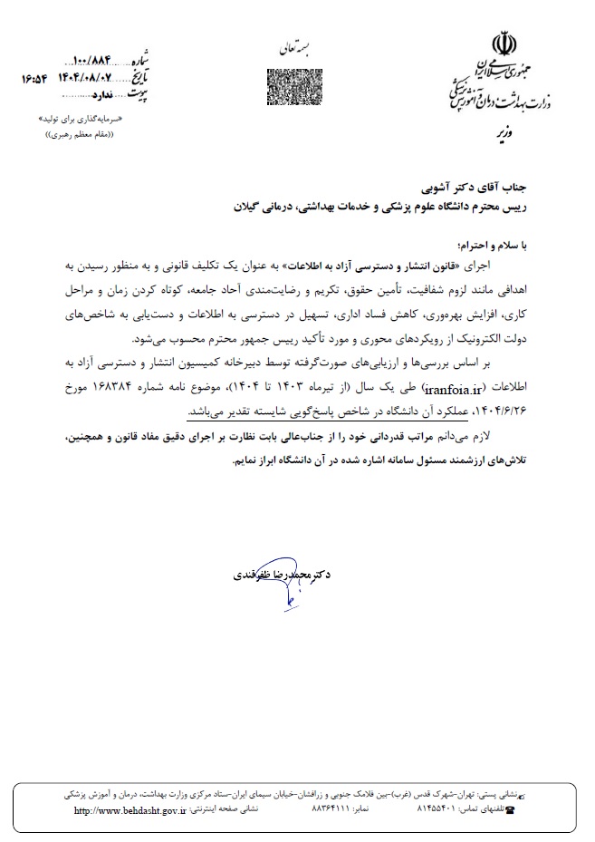 - تقدیر وزیر بهداشت از دانشگاه علوم پزشکی گیلان در اجرای قانون انتشار و دسترسی آزاد به اطلاعات