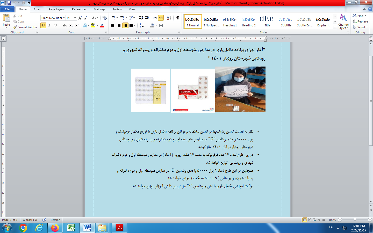 به گزارش روابط عمومی شبکه بهداشت و درمان شهرستان رودبار؛برنامه مکمل یاری ویتامینD و فرفولیک مدارس متوسطه اول و دوم دخترانه و پسرانه در شهرستان رودبار از تاریخ 1401/08/25 آغاز گردید،به همین مناسبت واحد تغذیه شبکه بهداشت و درمان شهرستان مطلب آموزشی ویژه مکمل یاری تهیه کرده که از طریق دانلود فایل زیر قابل دسترسی می باشد.