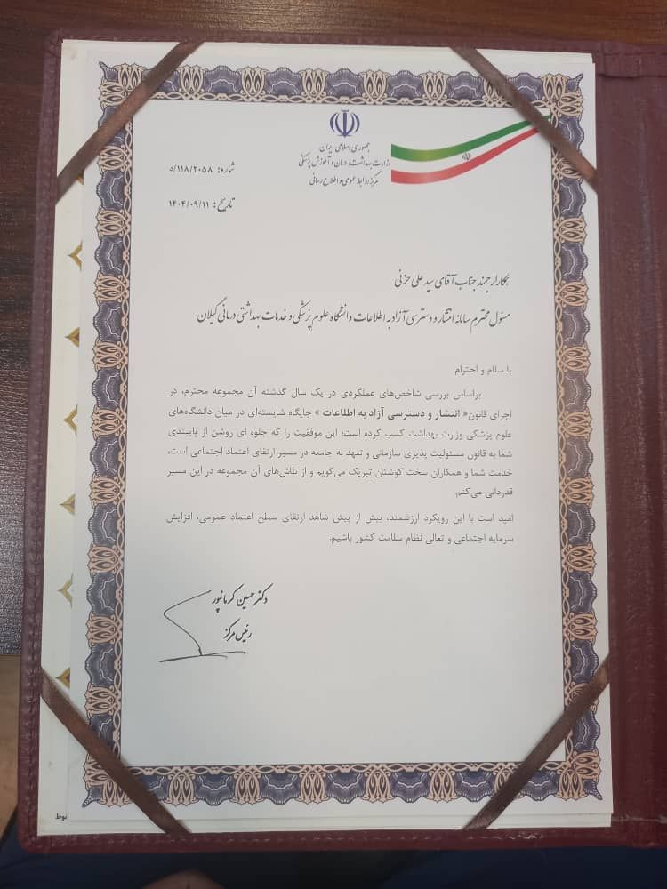 - تقدیر از دانشگاه علوم پزشکی گیلان توسط رئیس مرکز روابط عمومی و اطلاعرسانی وزارت بهداشت