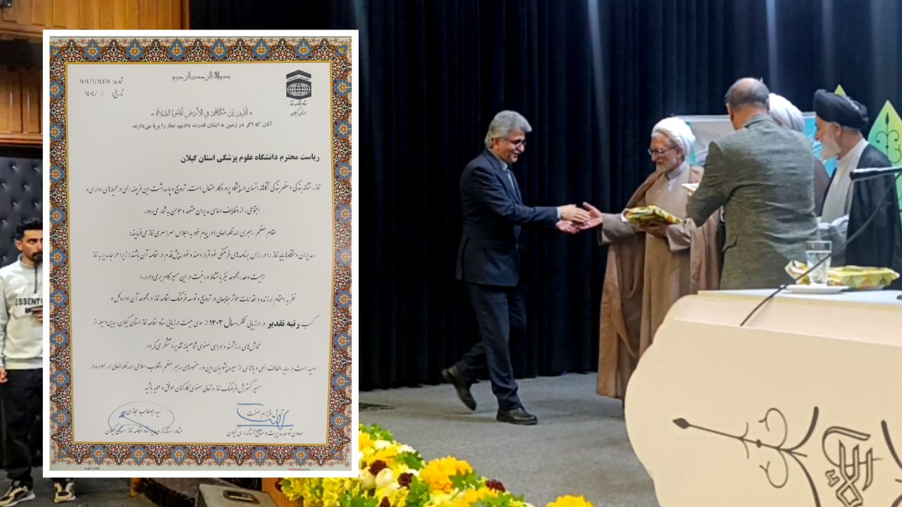 در مراسمی با حضور مدیران کل دستگاههای اجرایی استان و رئیس ستاد اقامه نماز گیلان، دکتر محمدتقی آشوبی، رئیس دانشگاه علوم پزشکی گیلان، به پاس اهتمام و اقدامات موثر در توسعه فرهنگ اقامه نماز در دانشگاه، با اهدا لوح تقدیر مورد قدردانی قرار گرفت.